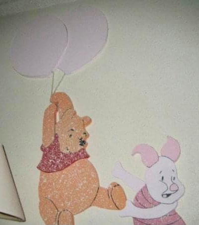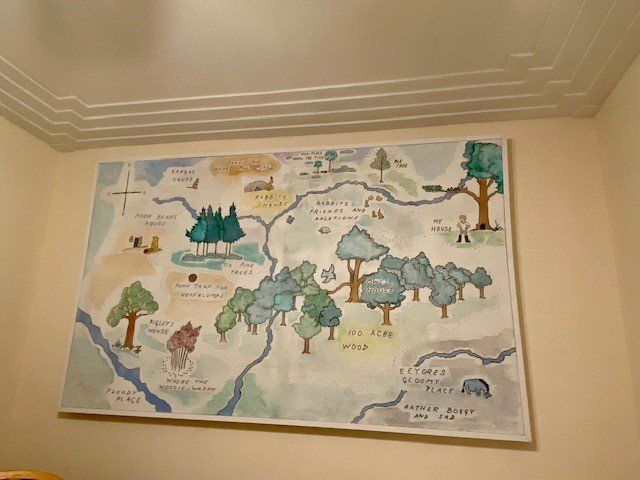 For smaller rooms, layering can create an accoustical effect with feeling of depth and size. Custom watercolor of the Hundred Acre Wood for babies room